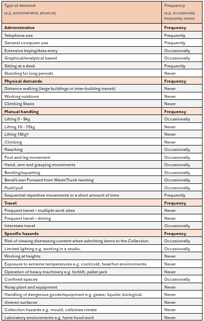 The following work environment description outlines the inherent requirements of the role and indicates how frequently each of these requirements would need to be performed. Please note that the National Film and Sound Archive is committed to providing reasonable adjustments and ensuring all individuals have equal opportunities in the workplace.