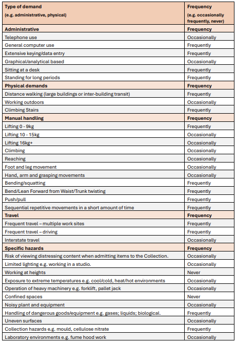 The following work environment description outlines the inherent requirements of the role and indicates how frequently each of these requirements would need to be performed. Please note that the National Film and Sound Archive is committed to providing reasonable adjustments and ensuring all individuals have equal opportunities in the workplace.
