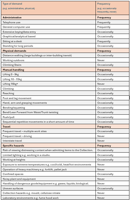 The following work environment description outlines the inherent requirements of the role and indicates how frequently each of these requirements would need to be performed. Please note that the National Film and Sound Archive is committed to providing reasonable adjustments and ensuring all individuals have equal opportunities in the workplace.