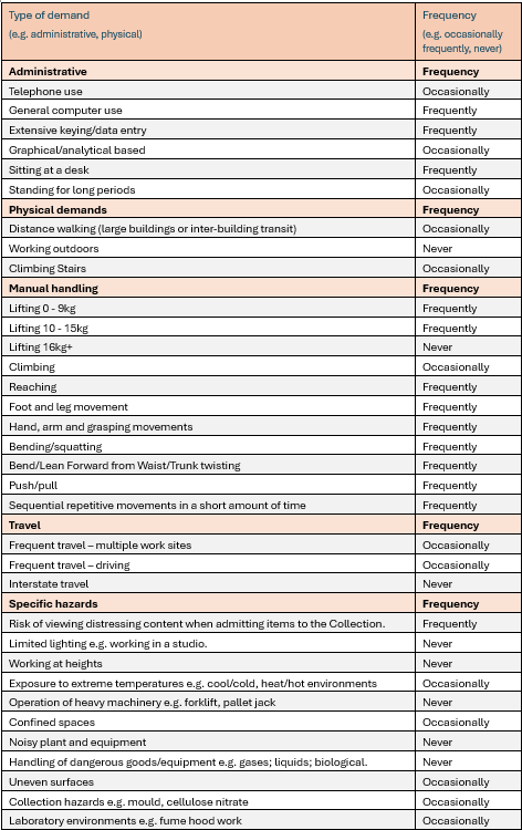 The following work environment description outlines the inherent requirements of the role and indicates how frequently each of these requirements would need to be performed. Please note that the National Film and Sound Archive is committed to providing reasonable adjustments and ensuring all individuals have equal opportunities in the workplace.