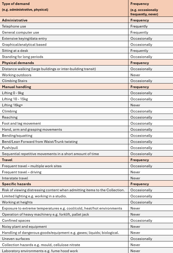The following work environment description outlines the inherent requirements of the role and indicates how frequently each of these requirements would need to be performed. Please note that the National Film and Sound Archive is committed to providing reasonable adjustments and ensuring all individuals have equal opportunities in the workplace.