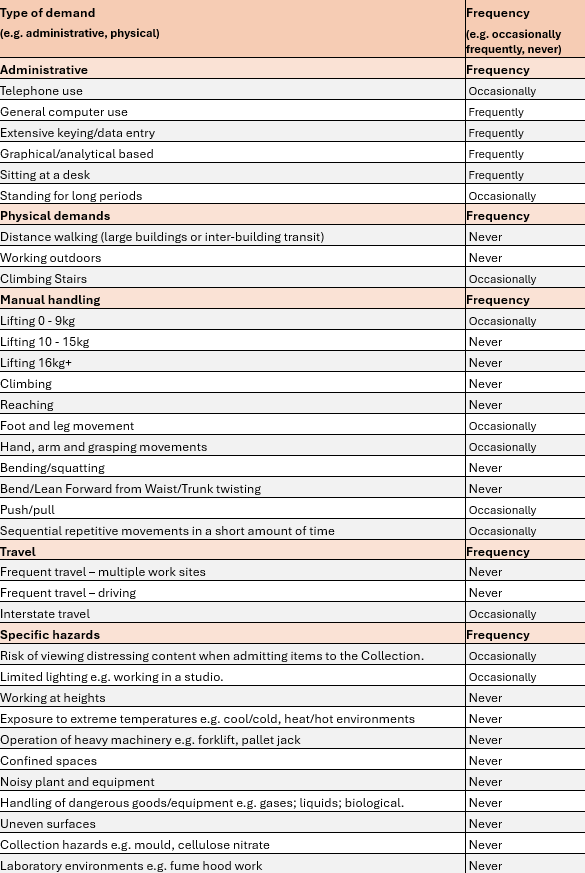The following work environment description outlines the inherent requirements of the role and indicates how frequently each of these requirements would need to be performed. Please note that the National Film and Sound Archive is committed to providing reasonable adjustments and ensuring all individuals have equal opportunities in the workplace.